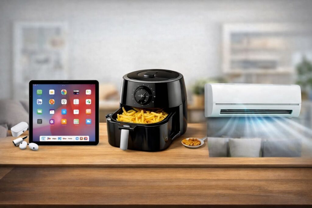 No tablet, isso aparece quando você usa muito fora da tomada e percebe que a bateria não acompanha sua rotina. Na air fryer, aparece quando você usa com frequência e nota que o gasto somado no mês pesa mais do que imaginava. E no ar condicionado, isso pode virar o assunto principal do seu verão, porque ele é um dos itens que mais impactam a conta.