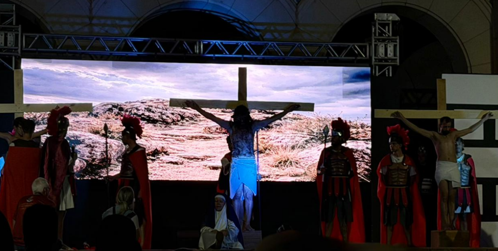 Um dos grandes destaques da noite foi a estrutura do espetáculo, que contou com telões de LED exibindo os cenários de cada momento da narrativa. O recurso trouxe ainda mais profundidade às cenas, tornando a experiência visual rica e envolvente, como se o público estivesse acompanhando de perto cada passo da caminhada de Jesus até a cruz.
